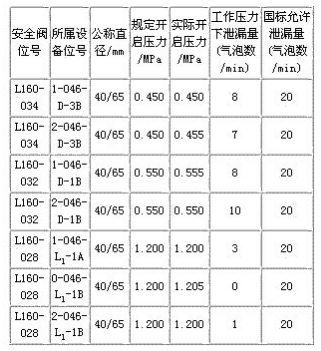 針對受熱變形泄漏問題,經反復比較試驗,改進了原安全閥密封結構,將閥瓣與導向塊連成一體,將錐面密封改為平面密封,增加了閥瓣厚度,并在閥座和閥瓣的密封面上堆焊鈷基硬質合金,以提高密封面的耐溫性能和表面硬度,解決了受熱變形泄漏問題,改進后的閥瓣結構見圖1b。根據成套設備的安裝尺寸及性能參數,首批試制了2個品種、3個規格共7臺平面密封安全閥,適用介質為聯苯加聯苯醚,工作溫度小于或等于330 ℃,開啟壓力分別為0.45MPa、0.55MPa和1.2MPa。安裝于某生產線上連續試用123天,停產檢修時拆下進行開啟壓力和密封性檢驗,結果見表1。表中數據說明,試用的這批安全閥,開啟壓力和密封性能均達到國家標準規定的優質品要求。